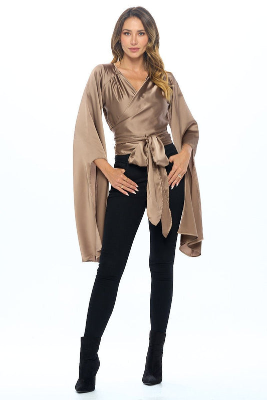 Stretch Satin Wrap Top with Exaggerated Sleeves