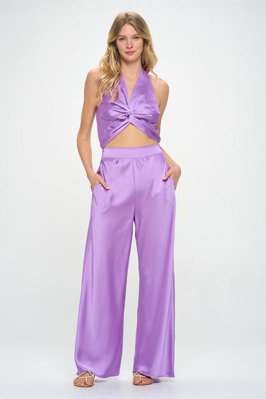 Satin Cowl Neck Short Sleeve Top with Scarf Detail